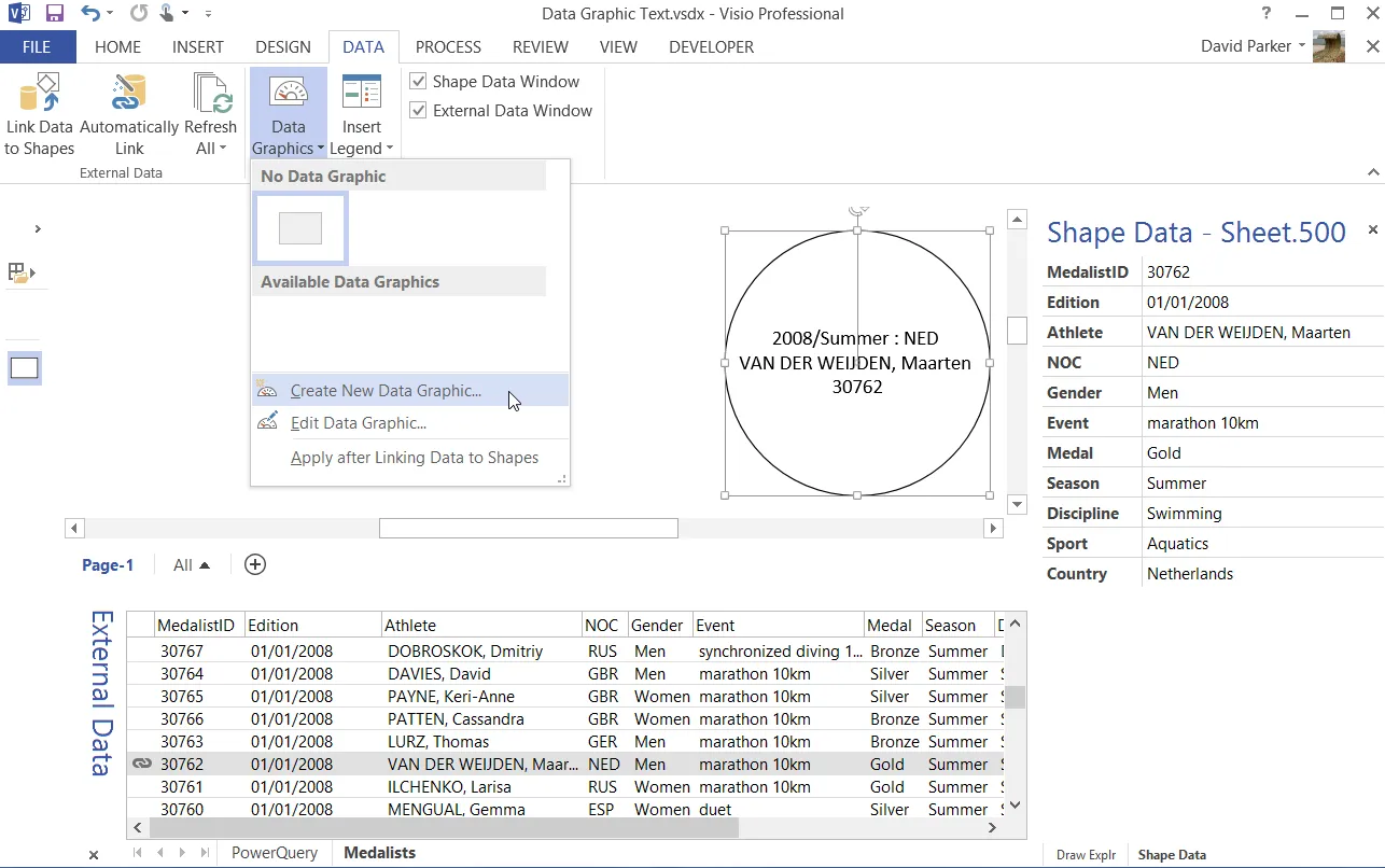 I have used the same Excel workbook of Olympics medal winners on Github at https://github.com/Microsoft/sql-server-samples/releases/tag/adventureworks, but I added a table of Olympic Committee NOC codes, and expanded the medallists table to include the full country name, along with the text for the discipline and sport ids.