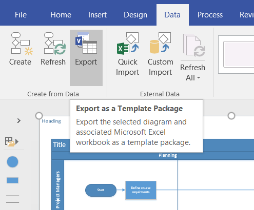 The process diagram is created within a special container shape. The Refresh and Export buttons on the Data / Create from Data ribbon group become enabled when this container is selected.