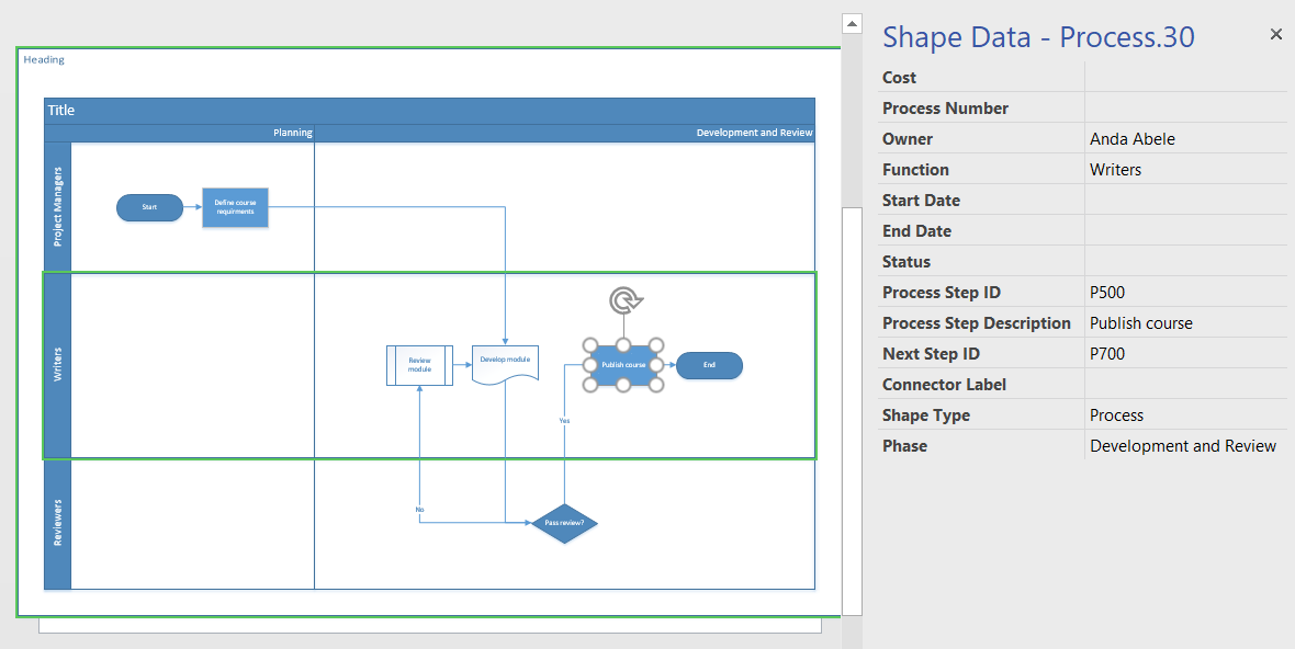 The diagram is then created according to the selections made in the wizard. Shape Data rows are added if they do not exist already, and the values are updated.
