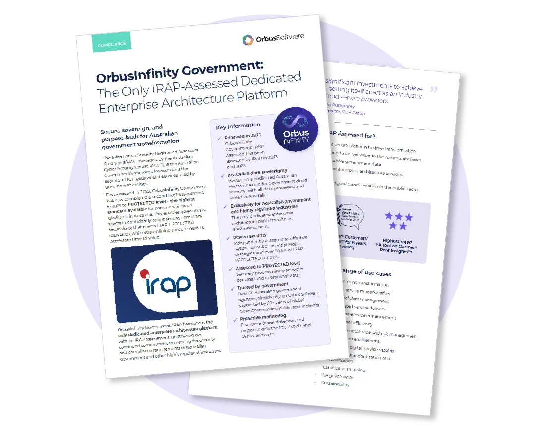 - How OrbusInfinity Government is the only dedicated enterprise architecture platform with an IRAP PROTECTED, purpose-built for Australian government transformation