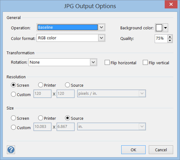 If I choose to export to a raster format like JPG, PNG, GIF, BMP or TIFF, then I will get a chance to transform the image, modify the resolution and size. It is useful to know what the target use will be because it is best to match the settings.