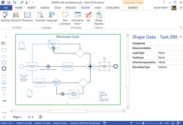 The following screenshot shows an example BPMN diagram with a Task shape selected so that its Shape Data can be reviewed.