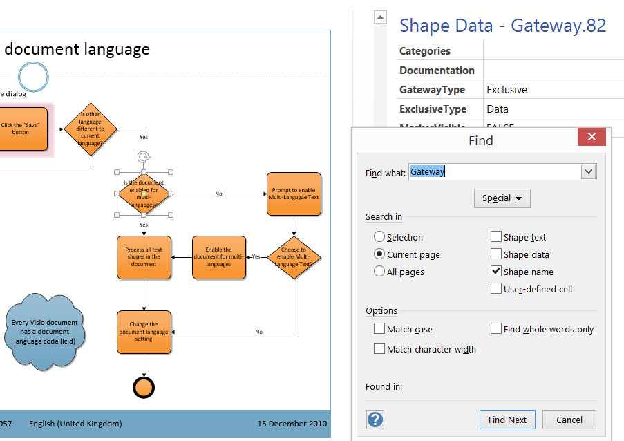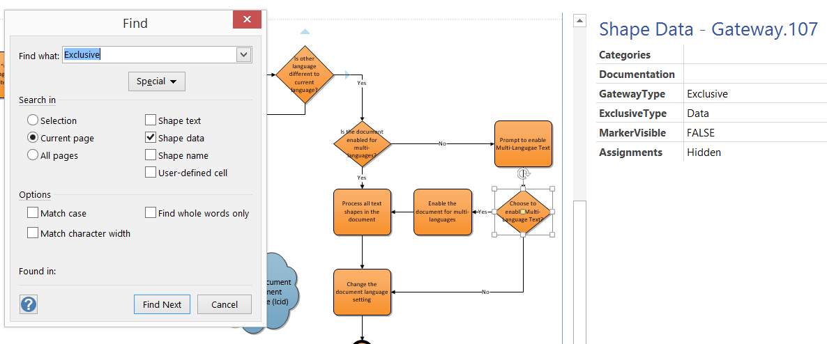 In this particular diagram type, each shape has some Shape Data, so I could use that to find shapes too, as in the following example where I have entered Exclusive for a value in the Shape Data.