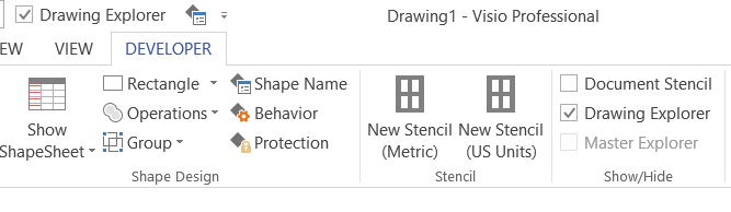 By default, Visio hides the DEVELOPER tab in the ribbon, because most users do not require the extra buttons. However, this tab does include two useful buttons, Shape Name and Drawing Explorer, for aiding navigation.