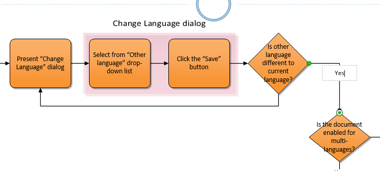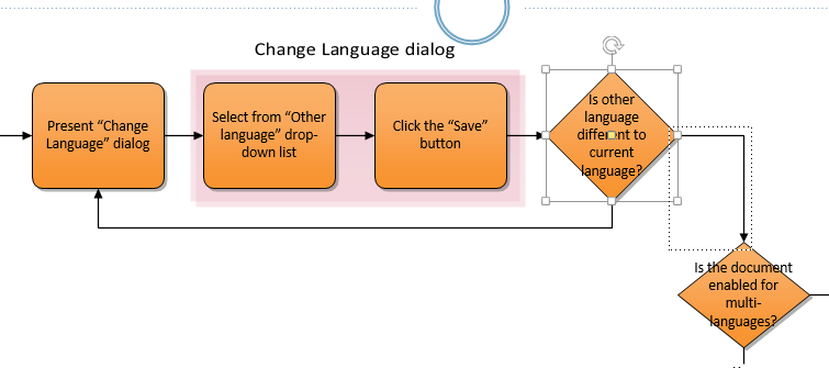I can select shapes in Visio with the mouse, but sometimes it is more convenient to use the keyboard. For example, the Gateway shape is selected in the following flowchart, as indicated by a rectangular alignment box with shape handles. However, I now want to enter text on the adjacent connectors, so I use the TAB key to move forward to the desired connector shape, as can be seen with the dotted rectangle around the connector to the right of the selected Gateway shape.