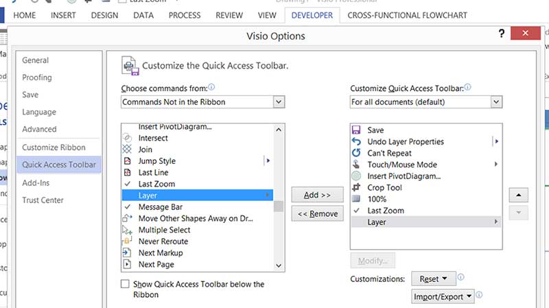 Another way that I can make the Visio interface more useful is to add in some of the commands that are not in either the Quick Access Toolbar or the Ribbon. For example, the Layer command is a useful dropdown list to display or assign the layer of the currently selected shape. In the following screenshot, I have opened the Visio Options dialog to add this to my Quick Access Toolbar.
