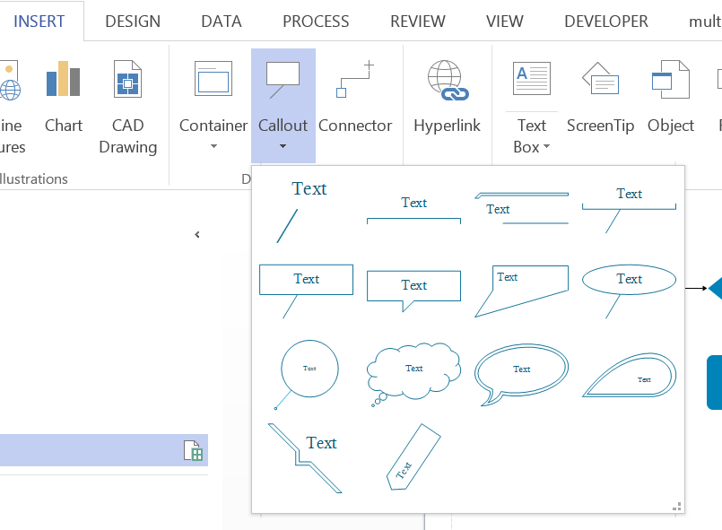 More recently, Microsoft added some structured diagraming features to Visio, and this includes the INSERT / Diagram Parts / Callout drop-down gallery which is enabled when a shape is selected.