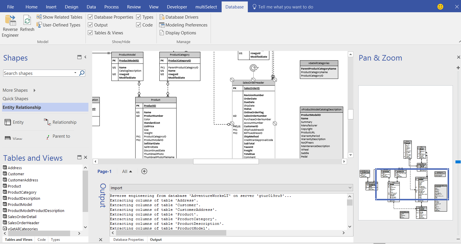 I must declare that I was an enthusiastic user of InfoModeler in the 90’s before the company was bought by Visio Corporation, and the technology became the database model diagram in Microsoft Visio. Of course, we originally had forward engineering too, and I often designed a prototype in Microsoft Access, sucked it into Visio, edited the schema in Visio (especially the indexes), and then forward engineered into SQL Server. I created schema documentation in Visio because it can be annotated and coloured, making discussion with other team members, and bosses, easier. This following screenshot is of a schema diagram of the sample AdventureWorksLT database that is available on SQL Azure, using the DBRE add-in.
