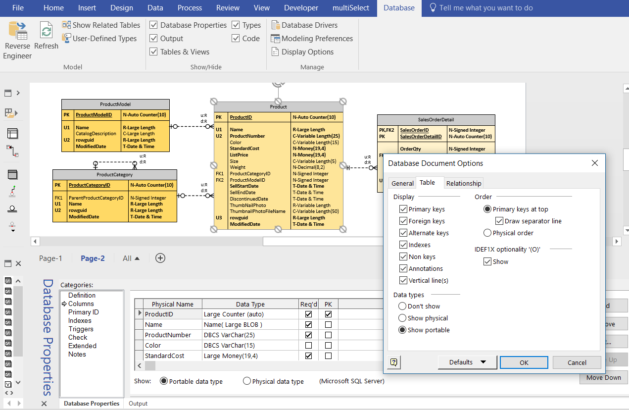 The Database Document Display options affect how each element is presented in the diagram. This affects all pages within the document, so it may be necessary to check the effect changes have on the arrangement on each page.