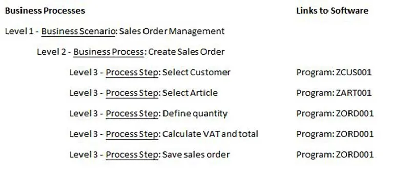 We can do this by creating a business process structure, that reflects the business processes on the one hand and links to software on the other hand. Below a simple example to illustrate this: