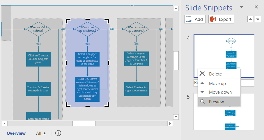This is a great new feature which has been frequently requested, and Microsoft has listened … eventually. It has surfaced in a more powerful incarnation than was probably imagined by most, and it provides a valuable ability to structure the presentation of the contents of a Visio document. Although its intended use is for creating PowerPoint slides, the concept of named areas that can be consistently re-called for previewing or printing, has many other usage scenarios. It could be specific areas on an office floor plan, or zones in a network layout, for example. Maybe Microsoft will add the ability to have multiple sets of Slide Snippets in the same document.