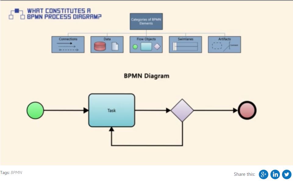 BPMN diagrams consist of two main types of elements: nodes and connections. In BPMN 2.0, nodes are represented with data, flow objects, swim lanes and artifacts whereas connections are represented with connecting objects.