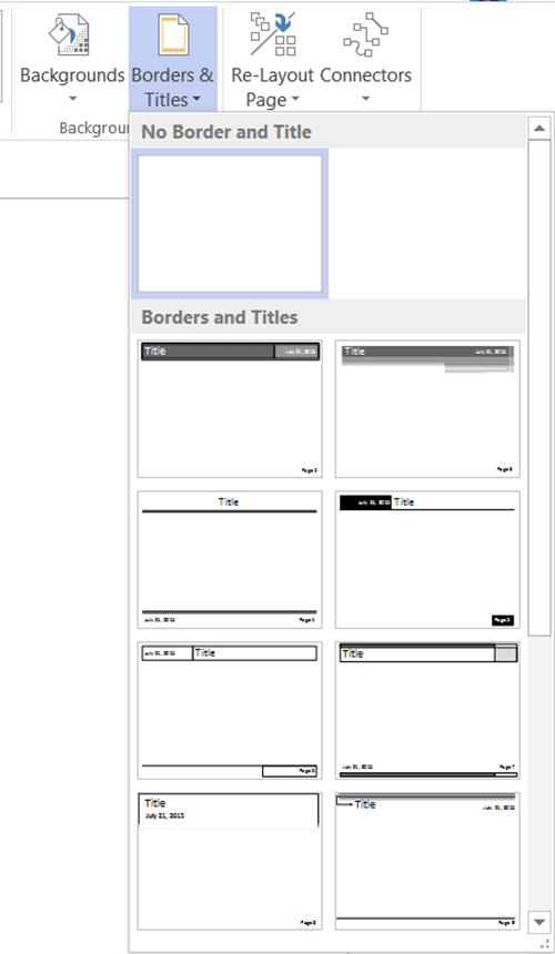 Borders and titles can be inserted in a similar manner to the background shapes, from Visio's Borders & Titles drop-down gallery.