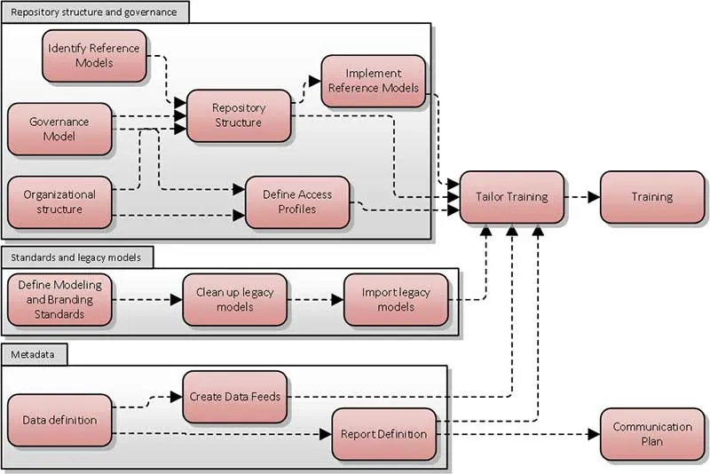 All three streams lead into the tailor training work item, which precedes only the training itself. In my experience, the training of the people who will use the tool should be the last item undertaken, as modelers should be able to log in and use the tool immediately after training. If they are forced to wait a number of days or weeks before they can implement what the training covers, then by the time they come to use the tool, half the training will have been forgotten and a refresher becomes necessary – making the original training pointless.