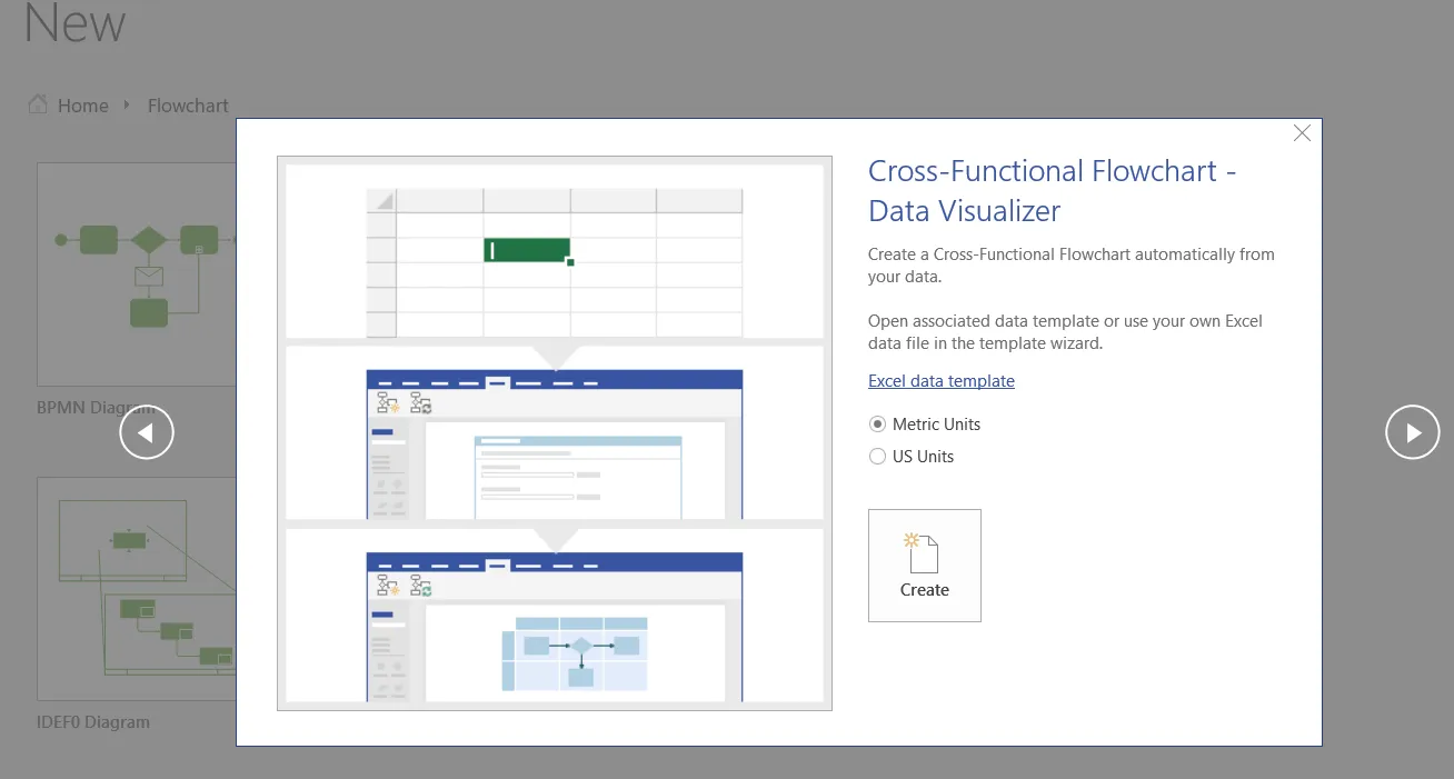 There are three types of diagrams to select from (Basic Flowchart, horizontal or vertical Cross-Functional Flowchart), then the table within the selected workbook.
