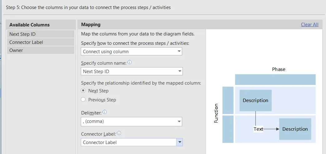 This step maps the columns for the unique identifier for each row (Process Step ID / Activity ID), and the shape text (Process Step / Activity Description) and type. It also allows an optional Alt Description for accessibility to be mapped.