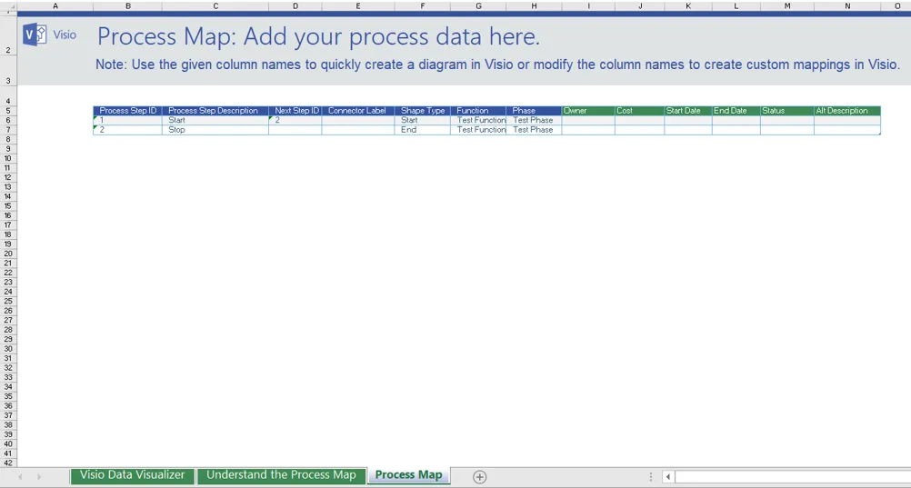 The blue coloured columns are the required ones, and the green ones are optional. In fact, the workbook can contain many tables, including those created by Get & Transform Data (Power Query), that describe multiple flowcharts because the wizard allows the desired one to be selected later.
