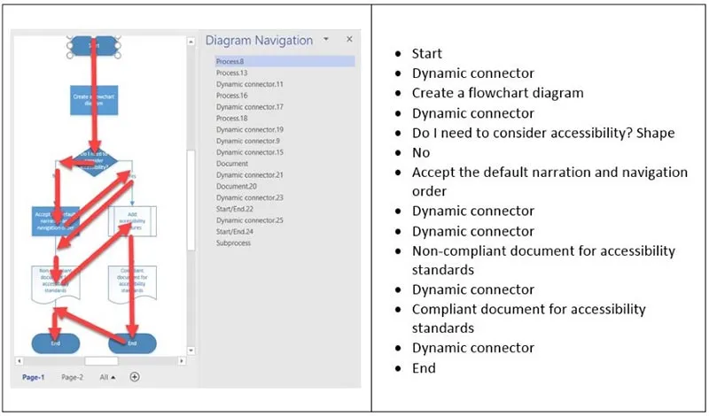 In this flowing screenshot, the red arrows indicate the default tab order of shapes in this small flowchart, and the narrator’s words as I tabbed from one shape to the text.