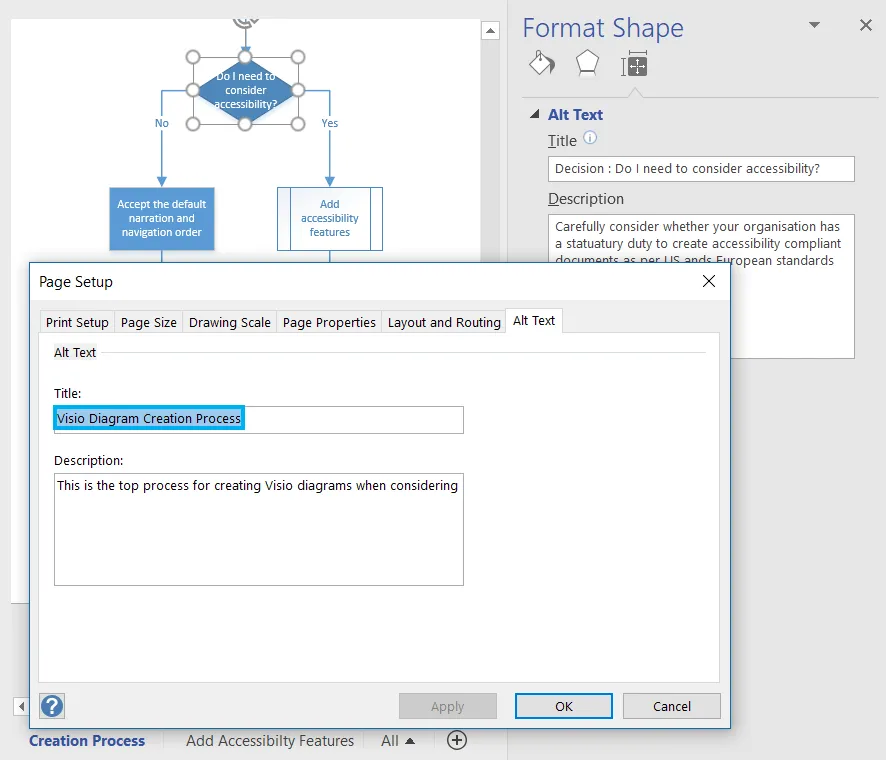The Alt Text can be added to each shape from the Size & Properties tab of the Format Shape window. It can also be added in the Alt Text tab of the Page Setup dialog for each page.