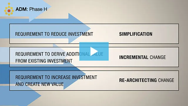 Change requests output from Phase H can be classified as Simplification - often driven by a requirement to reduce investment; Incremental change - driven by a requirement to derive additional value from existing investment; or Re-architecting change which is driven by a requirement to increase investment and create new value.